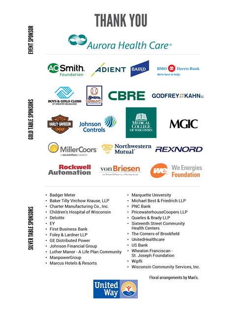 Each year, United Way’s Women’s Leadership Council welcomes hundreds of guests to The Pfister Hotel’s Grand Ballroom to celebrate the impact of women on our local community. In 2018, we heard from Keynote Speaker Anna Maria Chavez of the National Council on Aging, Linda T. Mellowes Woman Leader of the Year Award winner Elizabeth Brenner, and many more. Thank you to everyone who attended our largest Women United Bruncheon to date!