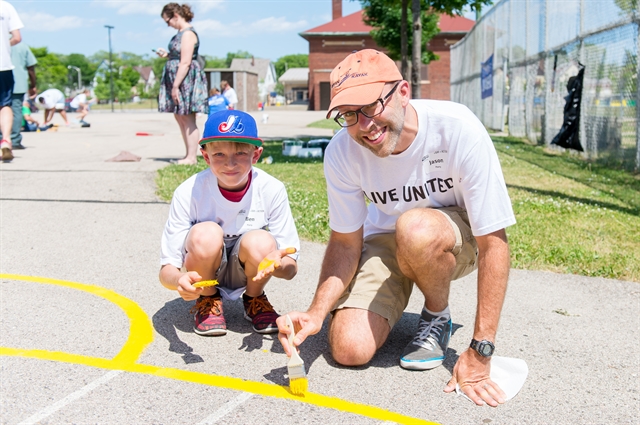 Jason Parry and his son paint the blacktop at a local school during 2016's Emerging Leaders Day of Action