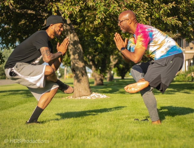 Shannon Reed Jr. (left) practicing yoga with his father, Shannon Reed, United Way's director of innovative strategies for Boys & Men of Color